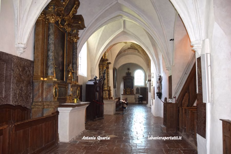 Nella navata nord menziono l’altare dedicato a Sant’Anna e l’altare dedicato a Santa Caterina, nella navata sud l’altare dedicato a San Giuseppe e l’altare dedicato alla Santa Trinità (“Dreifaltigkeitsaltar”).